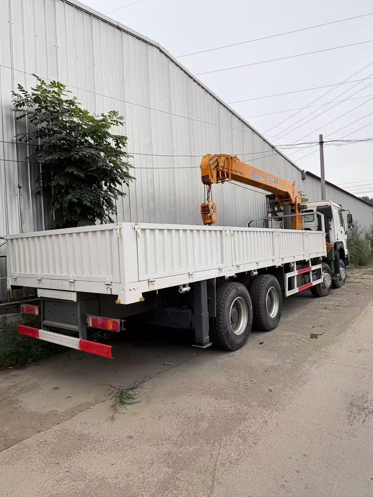 It is built on the Sinotruk HOWO 8×4 chassis, equipped with a folding-arm crane (typically with a lifting capacity of 10-20 tons), and features a flatbed cargo box design. It has the dual functions of \"transportation + lifting\" at the same time, mainly used in scenarios such as engineering equipment transfer, building material loading and unloading, and lifting and transportation of urban infrastructure materials. It is also commonly seen in fields like logistics and rescue.