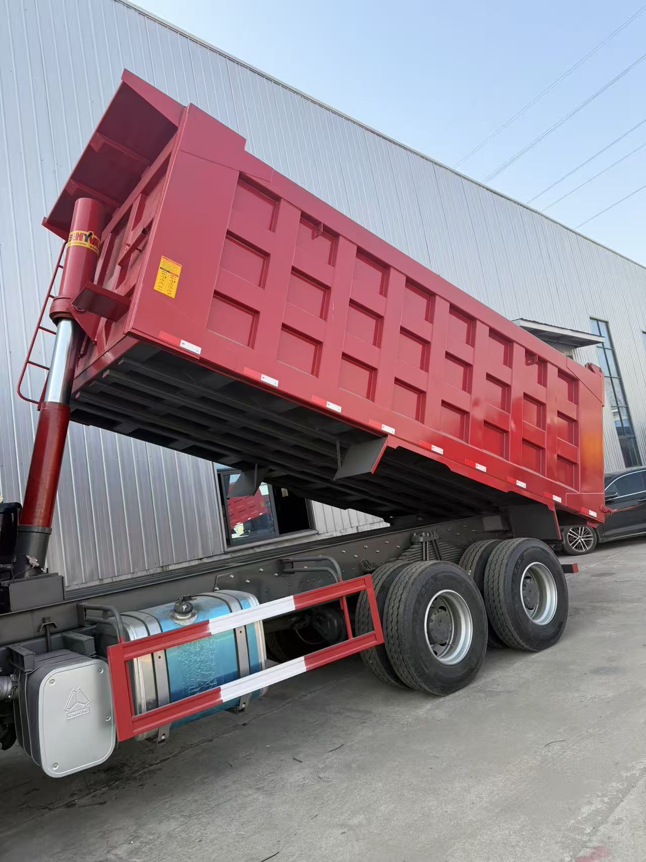 The body is painted in red, which is a classic color scheme for heavy-duty engineering trucks with high visual recognition; The outer side of the headlights is equipped with a black metal protective net, which can prevent damage to the lamps caused by gravel and debris during operation, and is suitable for complex scenes such as mines and construction sites.