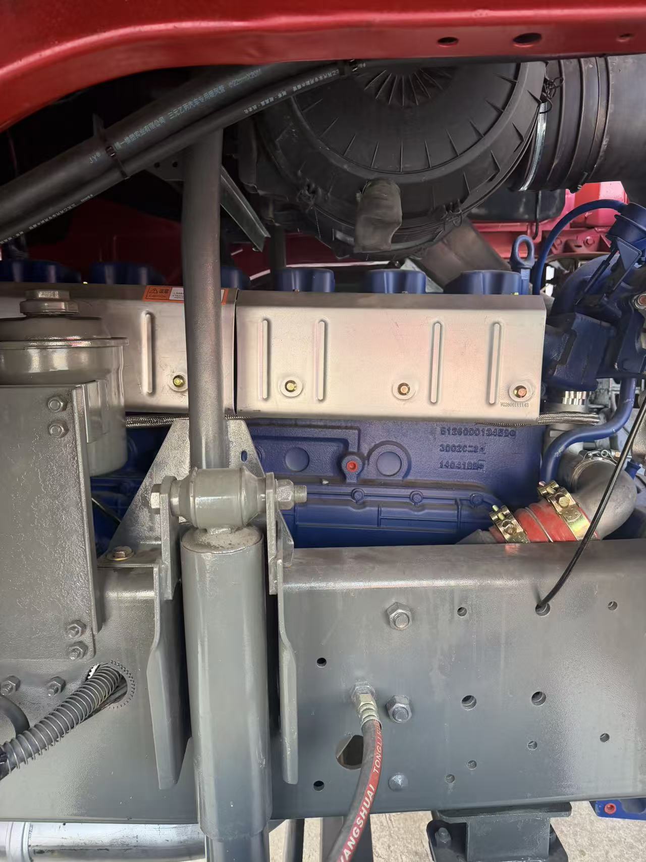 The body is painted in red, which is a classic color scheme for heavy-duty engineering trucks with high visual recognition; The outer side of the headlights is equipped with a black metal protective net, which can prevent damage to the lamps caused by gravel and debris during operation, and is suitable for complex scenes such as mines and construction sites.